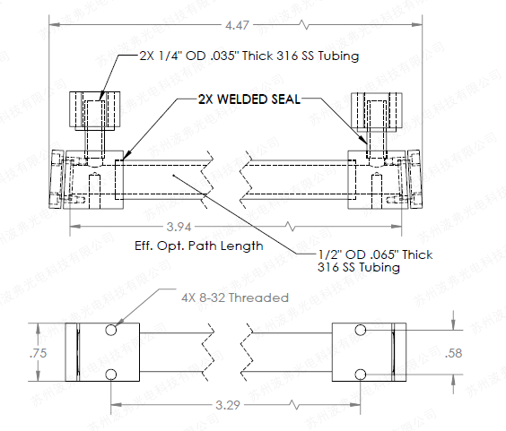 标准光路(相互作用)长度为 10 厘米,但可根据要求提供定制光路长度。 流通池的通光孔径为 0.375 英寸或 9.5 毫米。