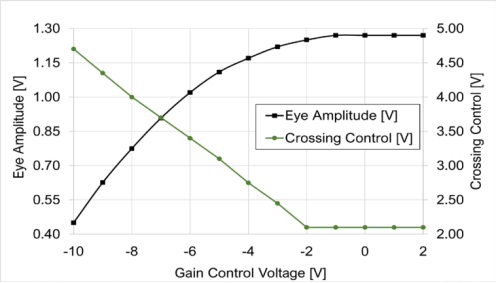 图13至图18中的数据是使用MICRAM DAC4信号源和带有50GHz(SE-50)远程采样模块的LeCroy SDA 100G采样示波器获得的。所有测量均在270mV输入眼振幅和51%输入眼交叉点进行。增益控制和交叉控制功能取决于输入幅度。交互调整两个控件以控制输出振幅,同时保持50%的交叉点,如图15至图18所示。
